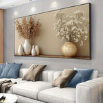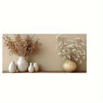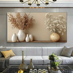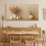 Apportez une touche d’élégance naturelle à votre salle à manger avec ce magnifique tableau mural représentant une scène florale tout en délicatesse. Des vases en céramique, des fleurs séchées et des tons beiges doux composent une ambiance chaleureuse, propice aux moments de partage autour de la table.