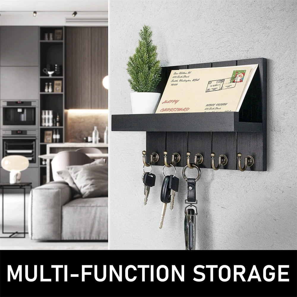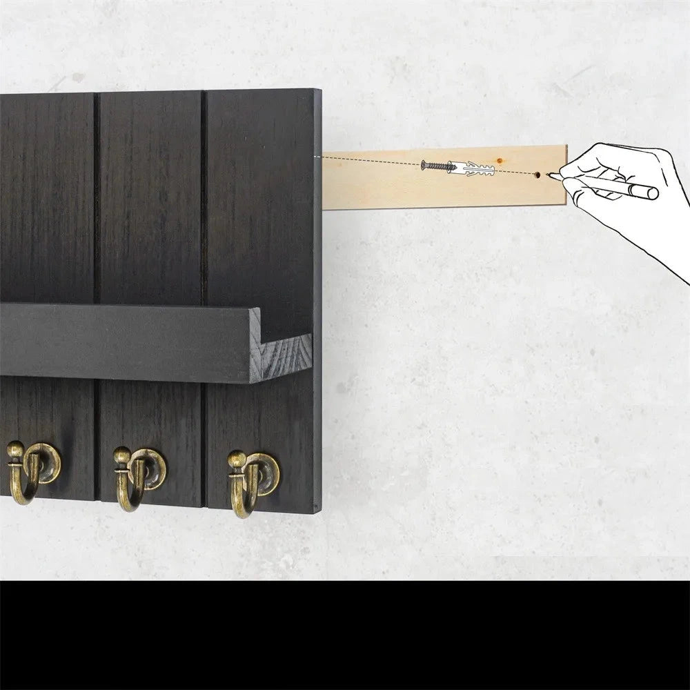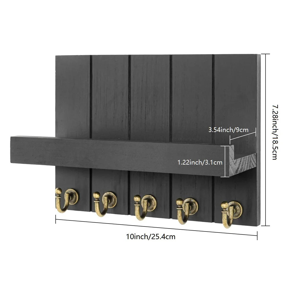 Apportez une touche de style à votre entrée avec cette boîte à clés murale au design moderne. Conçue en bois noir avec des crochets dorés raffinés, elle offre un bel équilibre entre utilité et décoration. Sa tablette intégrée permet de déposer courriers, plantes ou objets déco, tout en gardant vos clés parfaitement organisées grâce aux cinq crochets. Un accessoire compact et chic, idéal pour les intérieurs contemporains ou minimalistes.