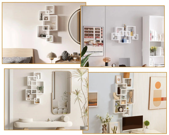 Transformez votre mur en œuvre d’art avec cette structure murale à cubes asymétriques. À la fois étagère et élément décoratif, elle met en valeur vos objets avec style.