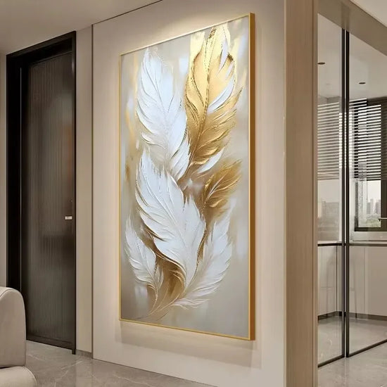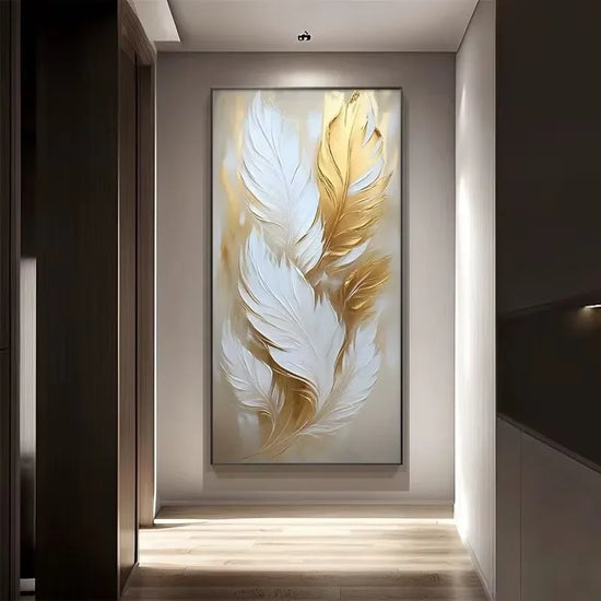 Ce tableau vertical aux plumes dorées et blanches évoque douceur et légèreté. Idéal pour structurer un espace étroit, il apporte profondeur et lumière à votre intérieur. Ce décor mural couloir transforme un simple passage en zone artistique et élégante. Un choix moderne pour une ambiance chic et apaisante.