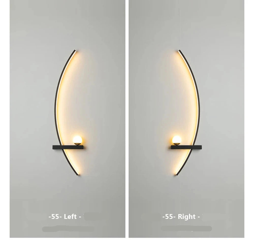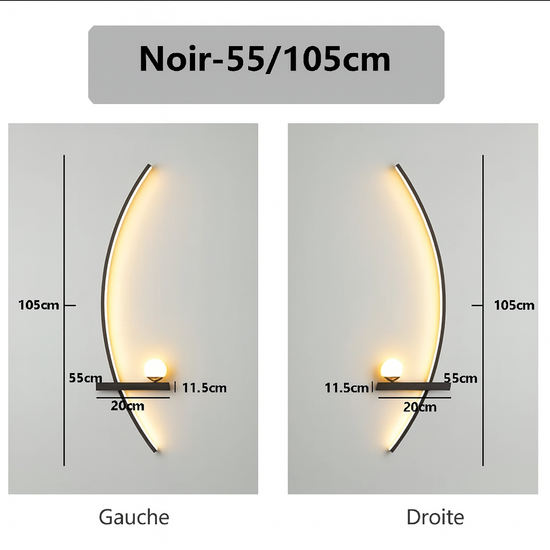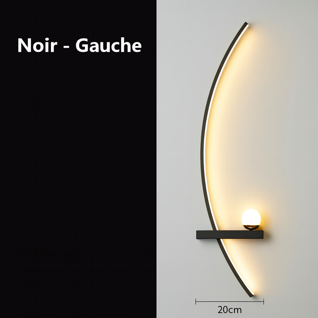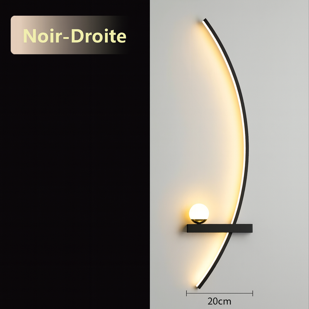 Ses lignes courbes, subtilement tendues vers le plafond, évoquent une demi-lune lumineuse ou une caresse futuriste sur le mur. La structure en métal noir, selon votre goût souligne l’élégance minimaliste de l’ensemble de la décoration murale, tandis que la lumière LED diffuse une clarté douce et enveloppante, idéale pour créer une ambiance feutrée et apaisante en fin de journée.