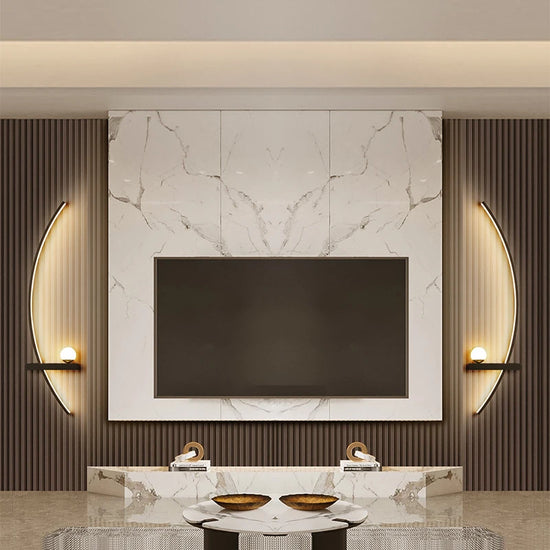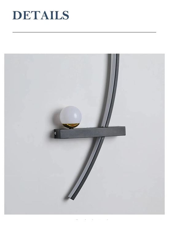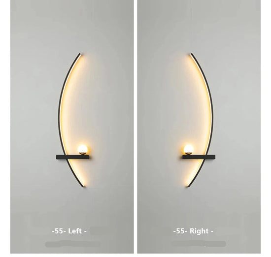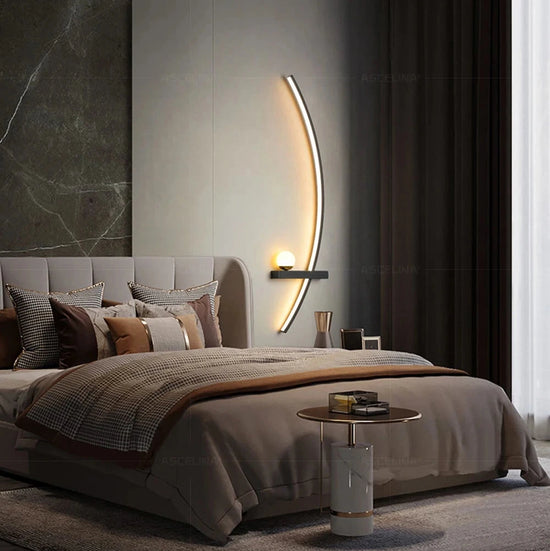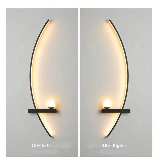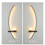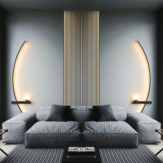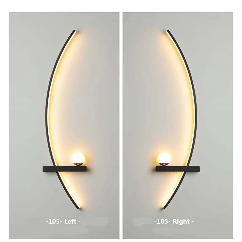 Ses lignes courbes, subtilement tendues vers le plafond, évoquent une demi-lune lumineuse ou une caresse futuriste sur le mur. La structure en métal noir, selon votre goût souligne l’élégance minimaliste de l’ensemble de la décoration murale, tandis que la lumière LED diffuse une clarté douce et enveloppante, idéale pour créer une ambiance feutrée et apaisante en fin de journée.