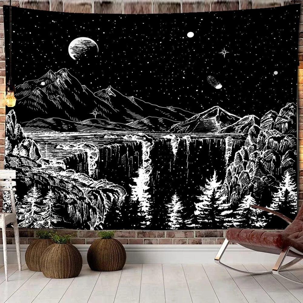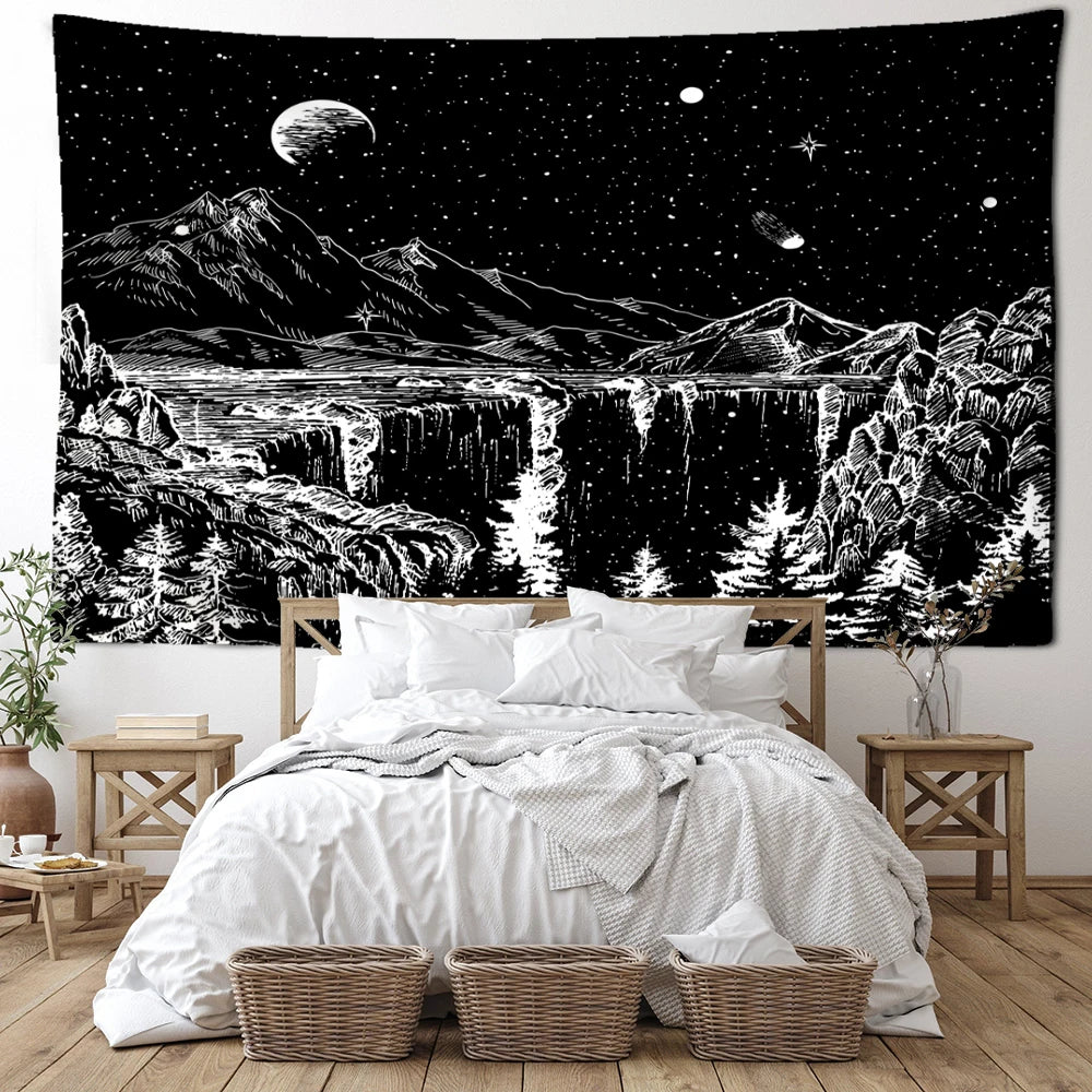 Sublimez l’ambiance de votre chambre avec cette tenture murale représentant un paysage nocturne en noir et blanc. Idéale comme décoration au-dessus du lit, elle transforme instantanément l’espace en une scène poétique et immersive.