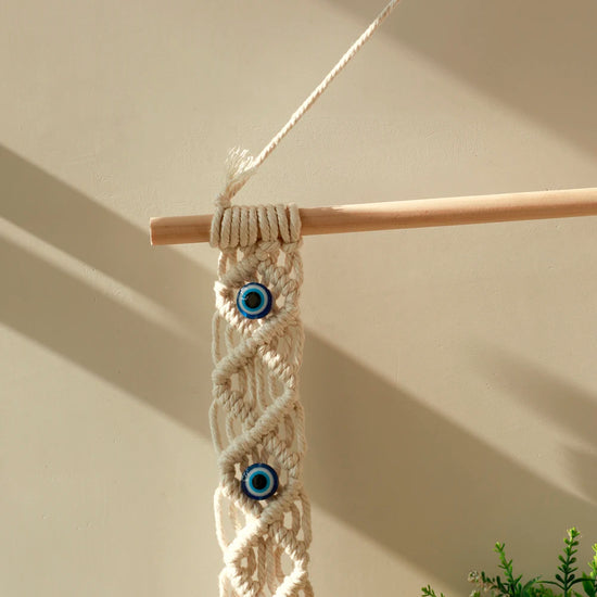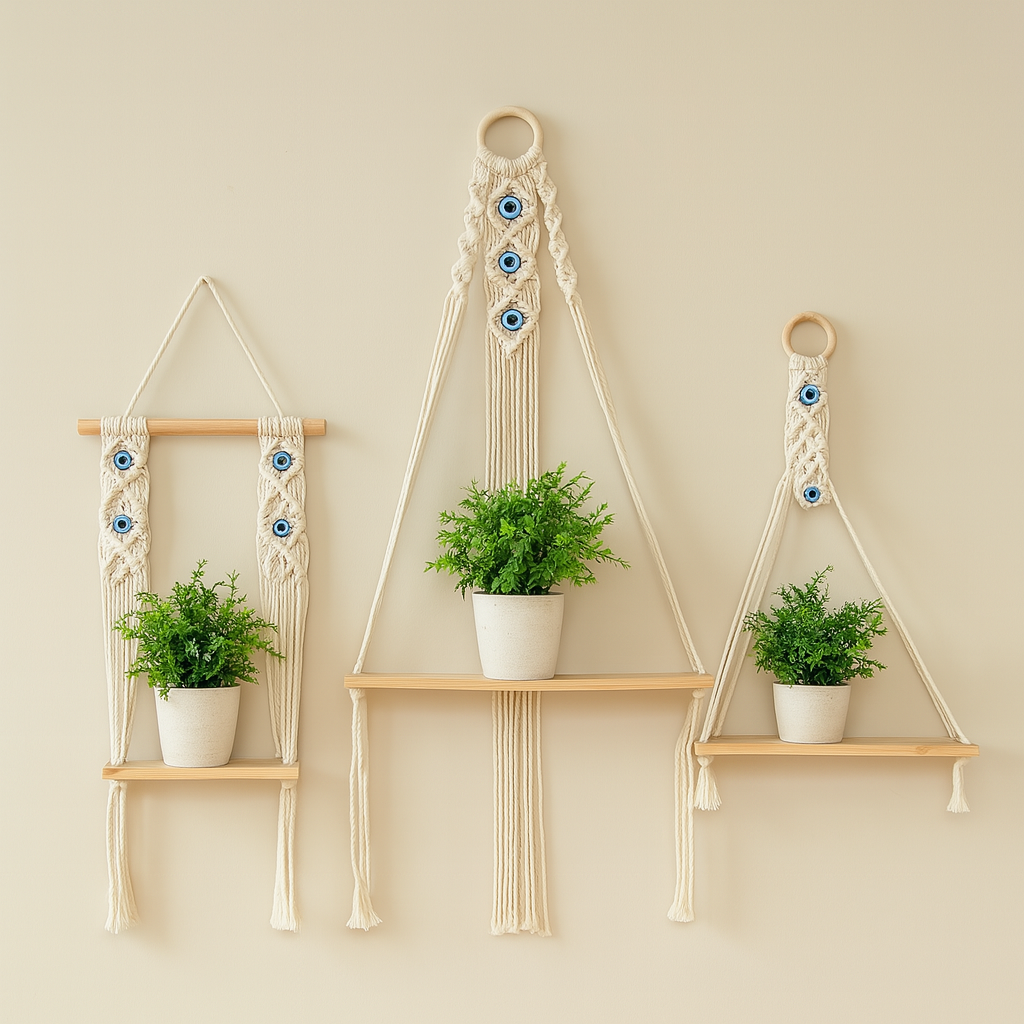 Apportez une touche naturelle, artisanale et protectrice à vos murs grâce à ces étagères suspendues en macramé. Idéale pour mettre en valeur une plante, une bougie ou un objet décoratif, elle allie élégance bohème et symbolisme bienveillant.