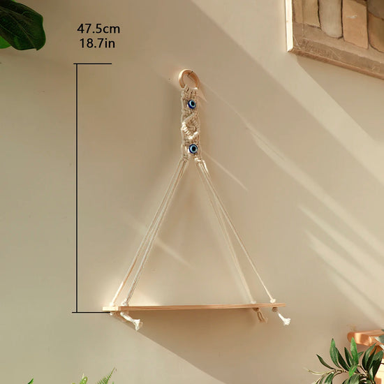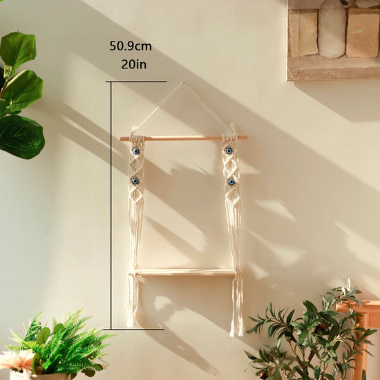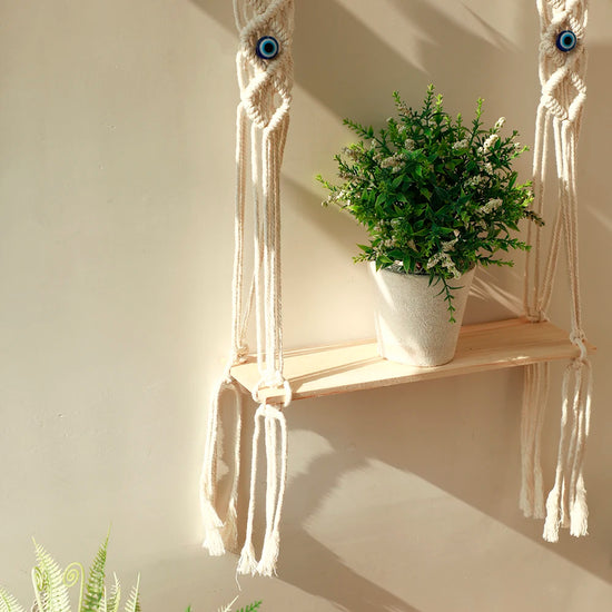 Sublimez votre intérieur avec cette étagère suspendue en macramé 100 % coton, tressée à la main avec perles œil protecteur. Parfaite pour une plante ou une bougie, elle apporte une touche bohème chic, naturelle et chaleureuse à votre décoration murale. Idéale pour le salon, la chambre ou l'entrée.