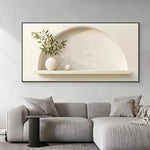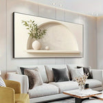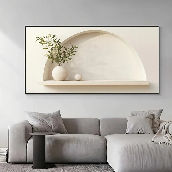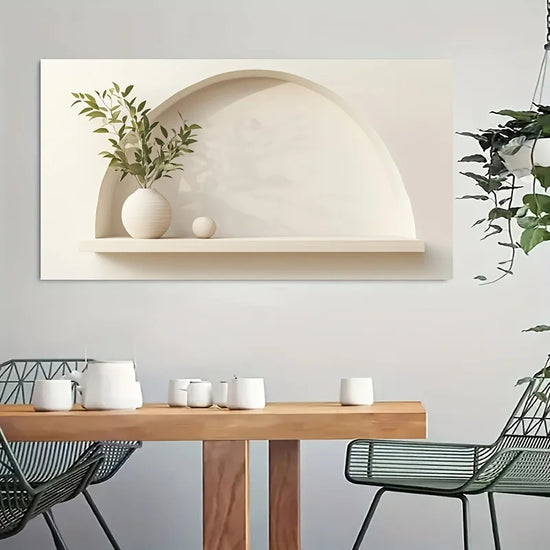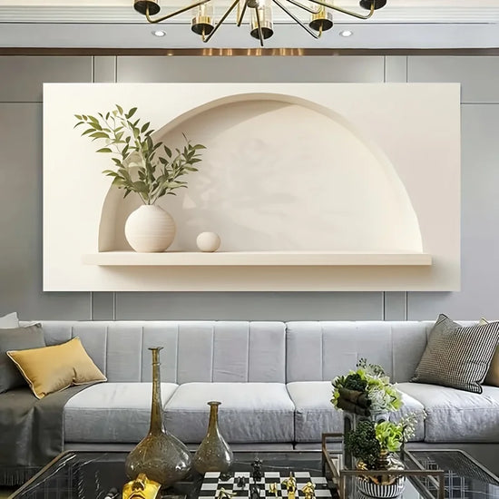Cette œuvre murale contemporaine imite à merveille une étagère encastrée ornée d’un vase et d’une sphère décorative. Le jeu d’ombres donne un effet trompe-l'œil bluffant, parfait pour enrichir subtilement une pièce avec style et sobriété. Une pièce décorative qui s’intègre harmonieusement dans les intérieurs modernes, bohèmes ou Japandi.
