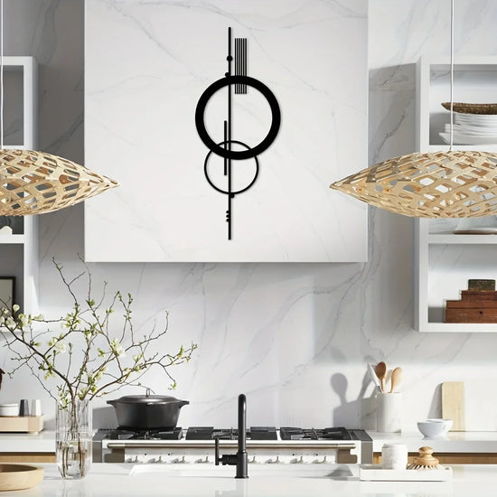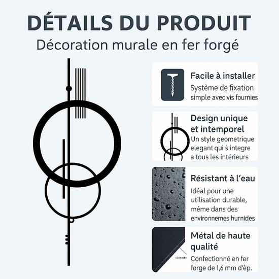 Élégance intemporelle, géométrie épurée et caractère affirmé : cette décoration murale en fer forgé transforme chaque mur en œuvre d’art. Son design aérien, fait d’anneaux entrelacés et de lignes verticales parfaitement équilibrées, évoque à la fois la modernité et la sérénité.