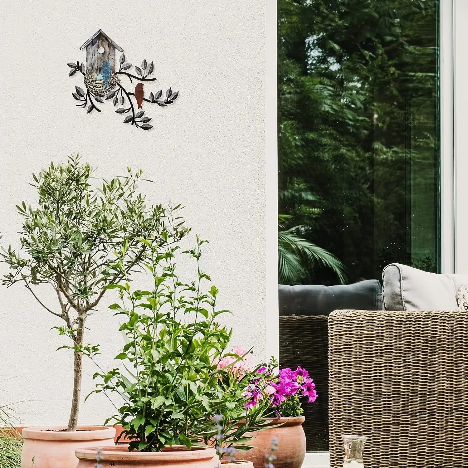Cette décoration murale extérieure en métal allie poésie et robustesse. Elle représente un charmant nichoir accompagné d’un nid et de deux oiseaux perchés sur des branches aux feuilles délicatement découpées. Son design évoque la douceur de la nature tout en offrant une touche artistique et chaleureuse à vos murs. Résistante aux intempéries, elle est idéale pour embellir un jardin, une terrasse ou une entrée. Une pièce décorative au style bucolique, parfaite pour créer une atmosphère accueillante et pleine de vie.