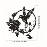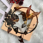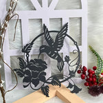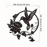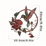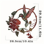 Motif ajouré représentant un colibri en plein vol avec des fleurs, dans un cercle harmonieux