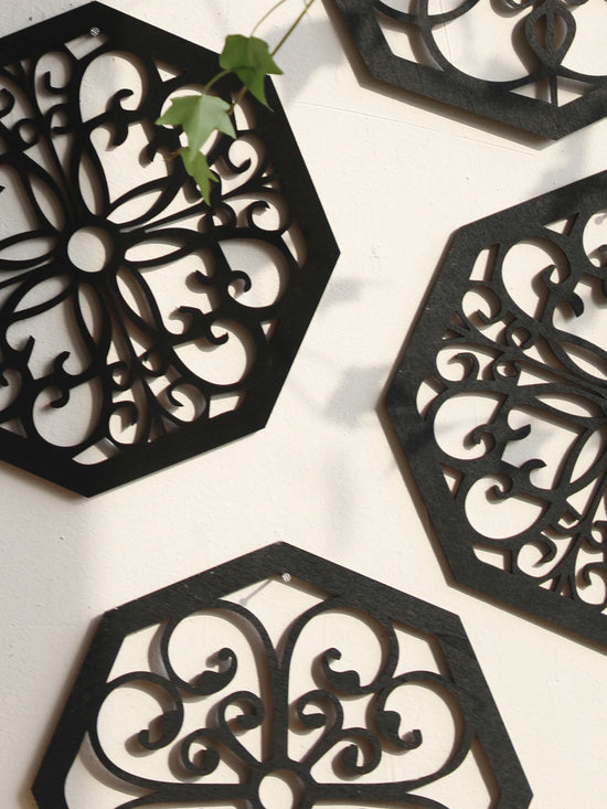 Ajoutez une touche de charme intemporel à vos extérieurs avec cet ensemble de décorations murales hexagonales en métal noir. Leurs motifs ajourés d’inspiration florale et géométrique créent un jeu d’ombres raffiné sur vos murs, apportant élégance et caractère à votre jardin, terrasse ou balcon. Que ce soit pour un espace détente verdoyant ou un coin repas extérieur, ces pièces subliment l’ambiance en toute subtilité.