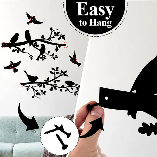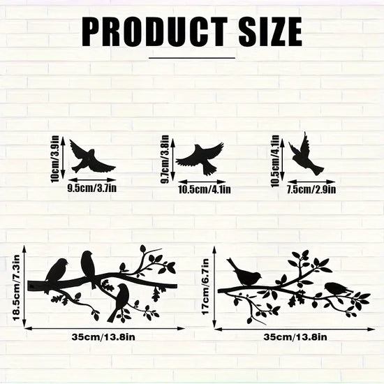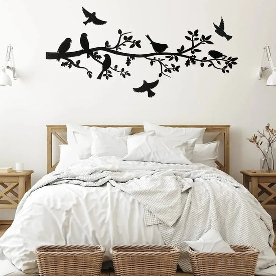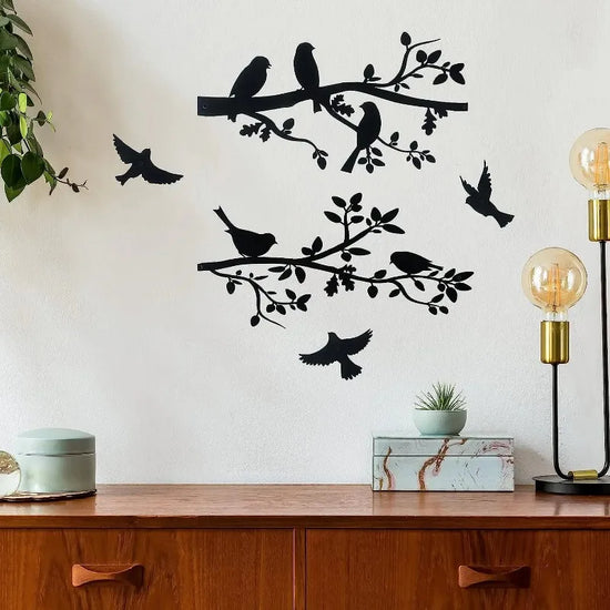 Silhouette élégante d’une branche garnie d’oiseaux en vol ou perchés, pour une touche poétique et vivante.