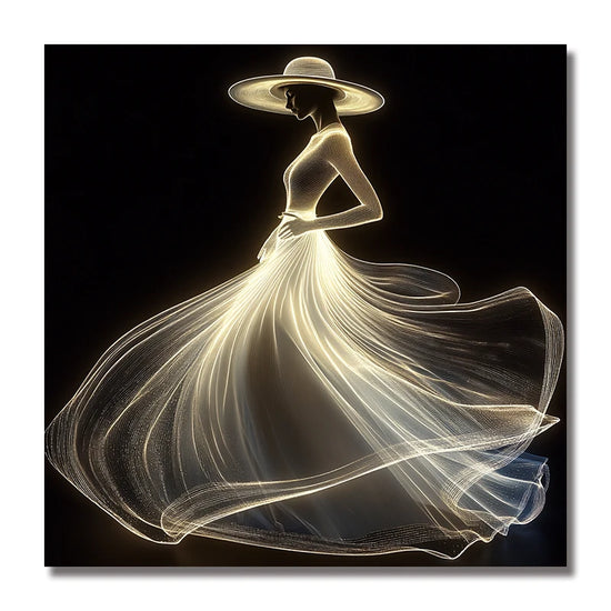 Apportez une touche artistique et sophistiquée à votre intérieur avec ce décor mural captivant. Elle met en scène une silhouette féminine stylisée, sublimée par un jeu de lignes fluides évoquant la lumière et le mouvement. Son rendu visuel évoque la grâce d'une robe virevoltante, dans une palette de contrastes subtils entre ombres et éclats dorés. Parfaite pour un salon ou un espace moderne, cette œuvre devient instantanément le point focal d'une pièce. Une décoration à la fois contemporaine et poétique, qui célèbre l’élégance féminine avec originalité.
