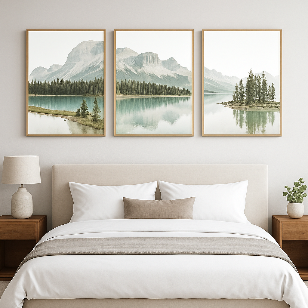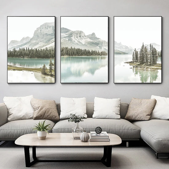 Ajoutez une touche de sérénité et d'élégance à votre chambre avec ce magnifique triptyque mural. Inspiré par les paysages alpins, ce tableau en trois parties capte la majesté de la nature avec ses montagnes imposantes, ses forêts de conifères et son lac miroir aux reflets apaisants.