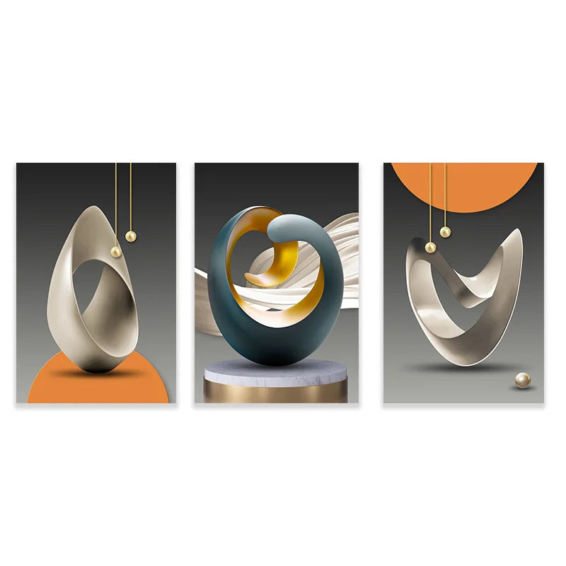 Apportez une touche de raffinement à votre salon avec ce triptyque de peintures abstraites modernes. Ces œuvres jouent subtilement avec les formes géométriques, les reflets métalliques et les contrastes de couleurs chaudes pour créer une ambiance chic et contemporaine.