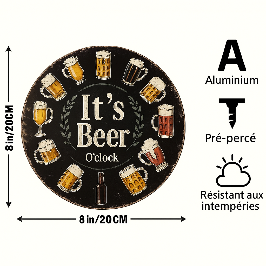Message central « It’s Beer O’clock » amusant et accrocheur, parfait pour instaurer une ambiance décontractée.