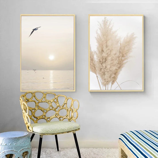 Composé de trois affiches aux teintes neutres et apaisantes – coucher de soleil en bord de mer, herbes de pampa et vague sur la plage – ce set donnera une ambiance sereine et naturelle. Parfait pour un salon, une chambre ou une entrée, il s’intègre harmonieusement dans un décor minimaliste, bohème ou nordique.