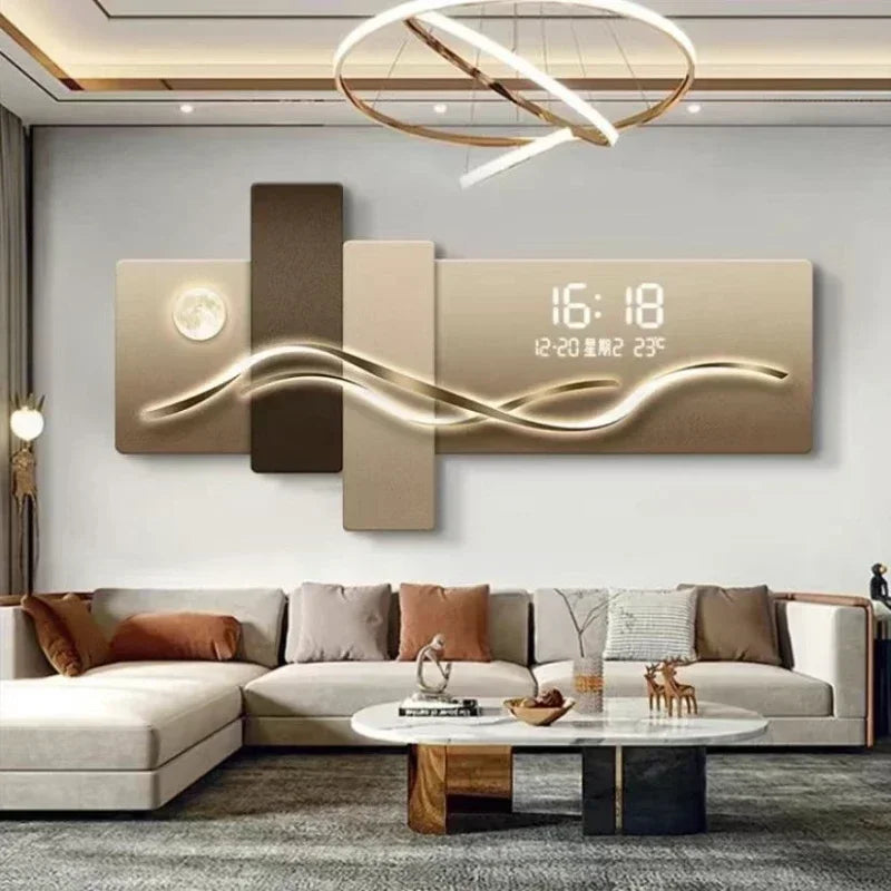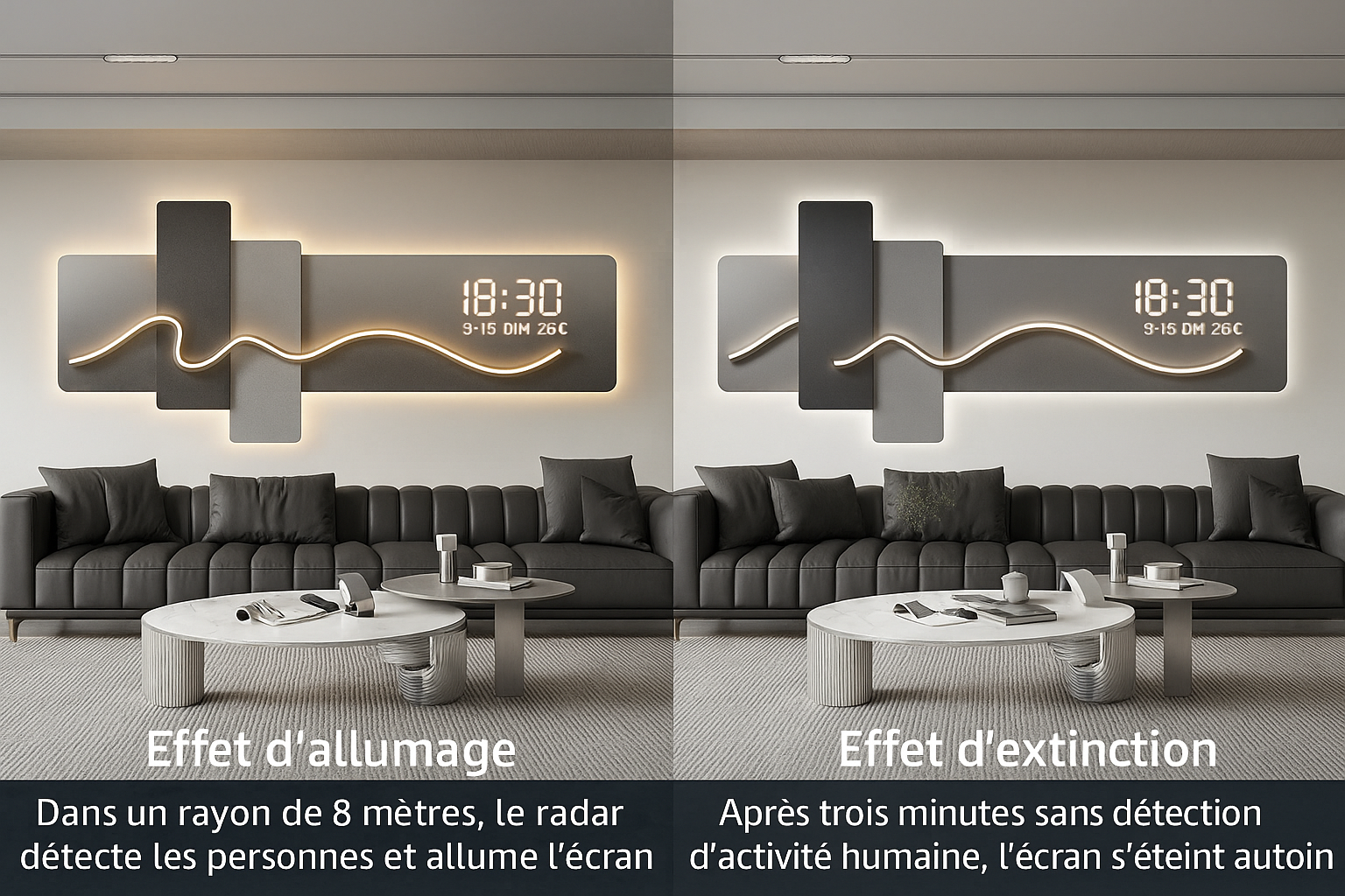 Effet 3D rétroéclairé : grâce au halo LED intégré, l’horloge crée une profondeur visuelle élégante et moderne, idéale pour un salon haut de gamme.