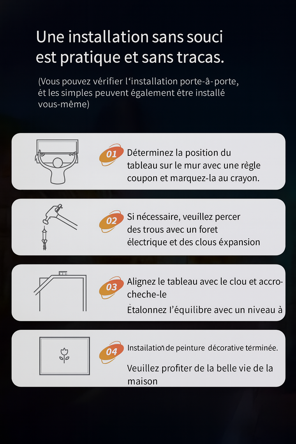 Profitez d’un design moderne et raffiné sans tracas : en quelques étapes, transformez votre mur en véritable œuvre d’art. Pas besoin d’être bricoleur, tout est pensé pour que vous puissiez installer votre décoration en toute simplicité, avec un rendu professionnel.