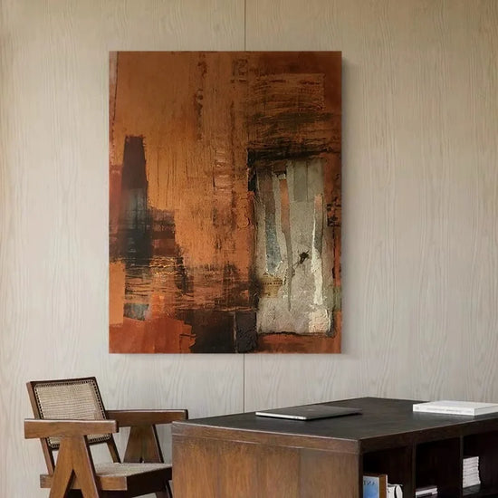 Sublimez vos murs avec cette toile décorative aux teintes terre cuite et profondes. Inspirée des textures naturelles et des pigments minéraux, elle insuffle une atmosphère enveloppante, entre modernité brute et poésie visuelle. Une pièce idéale pour structurer votre mur tout en y ajoutant une âme artistique.