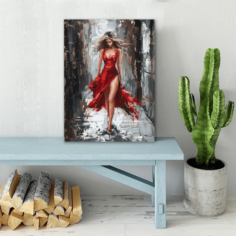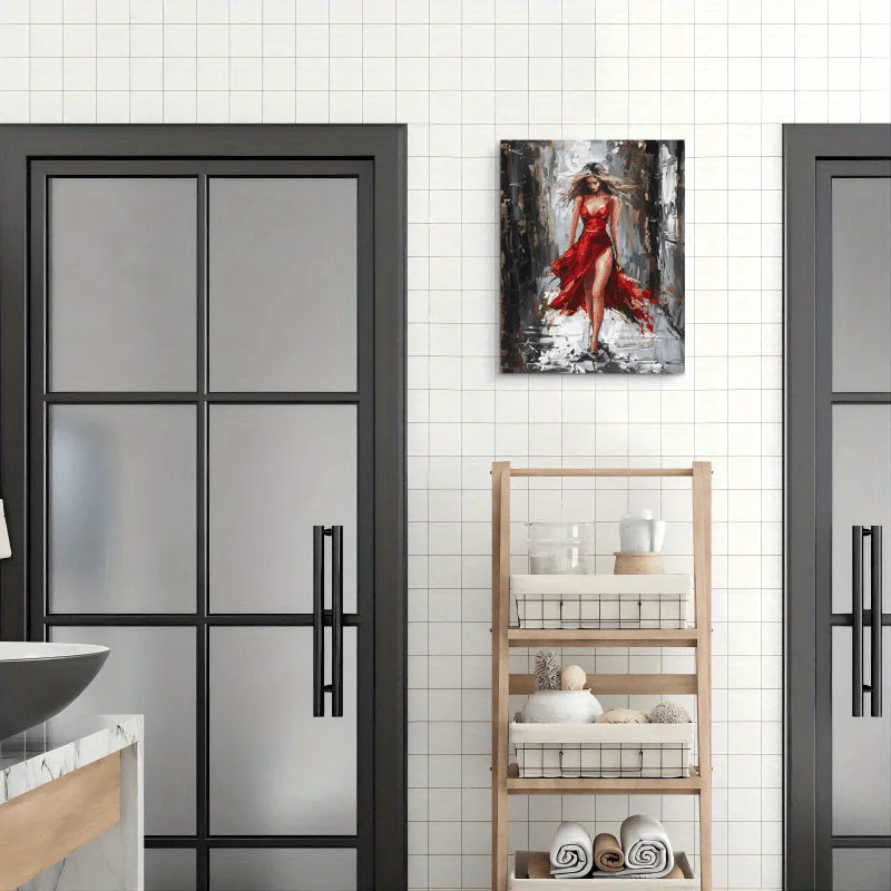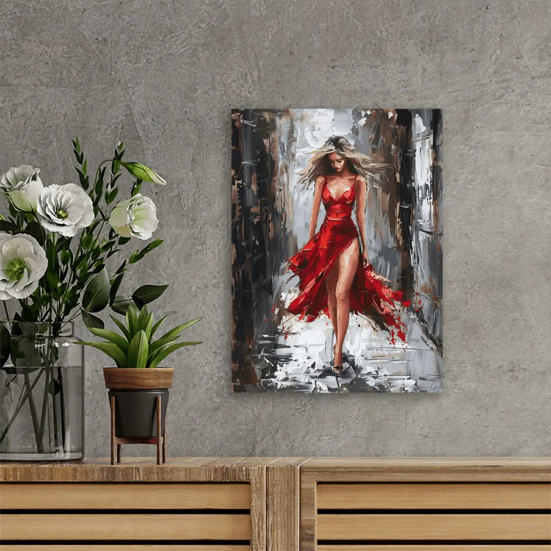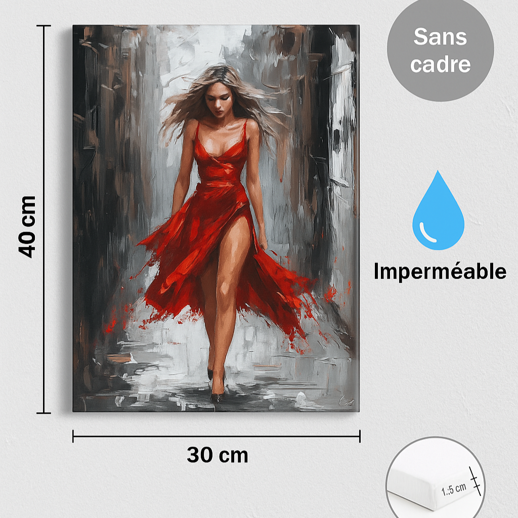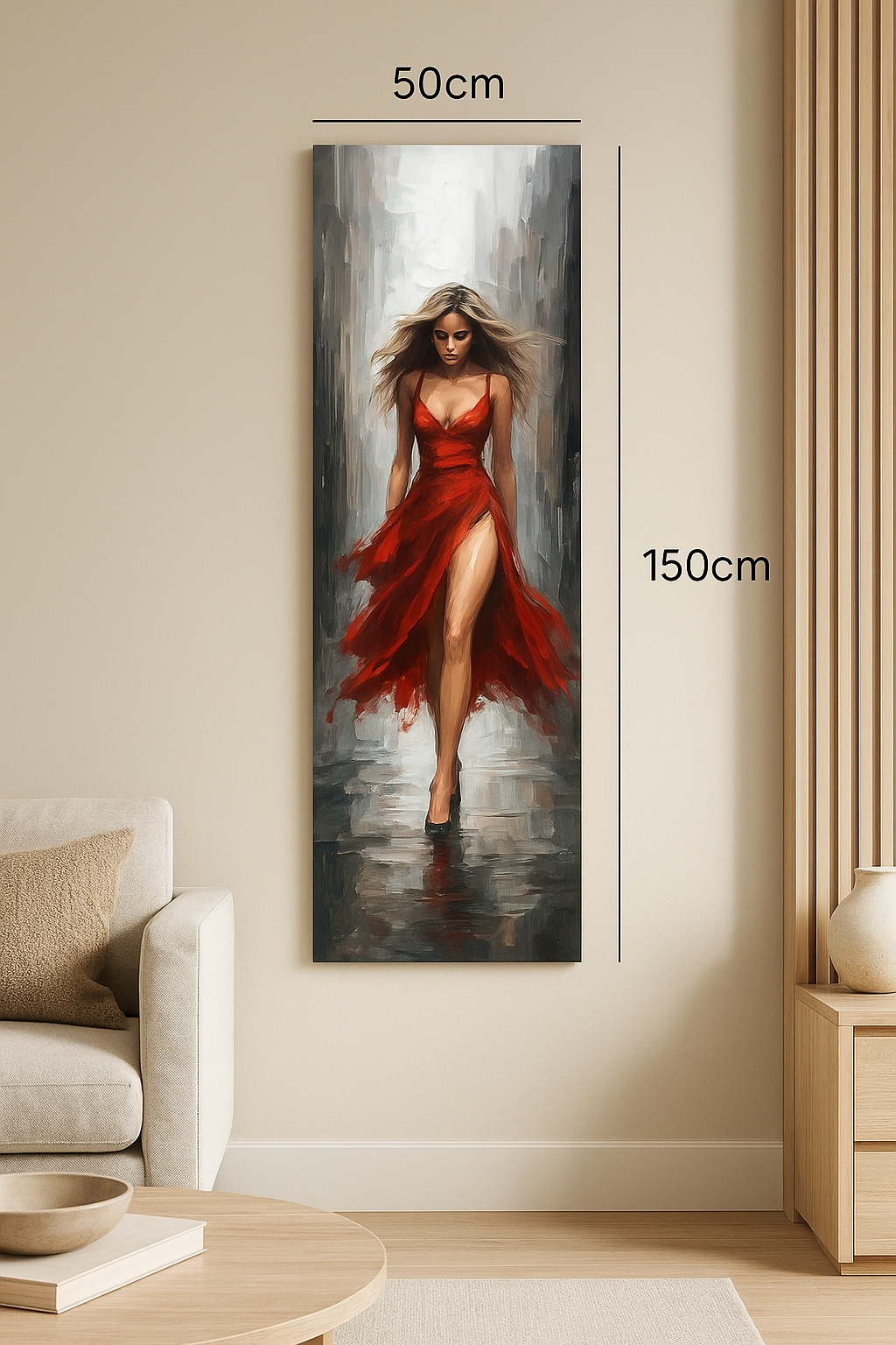 Transformez votre espace avec cette décoration murale verticale au charme affirmé. Ce tableau représente une femme élégante en pleine marche, sublimée par une robe écarlate éclatante. Une invitation à l’assurance et au style.