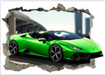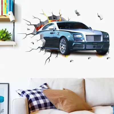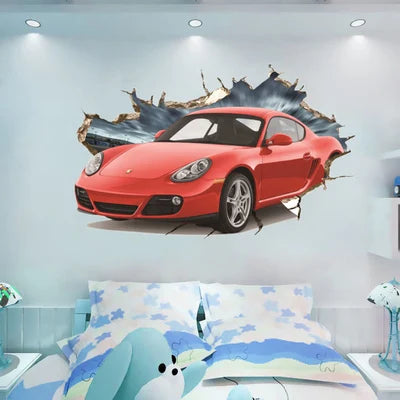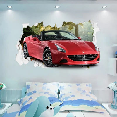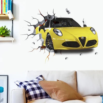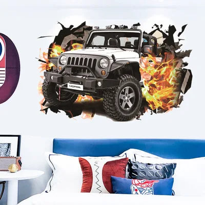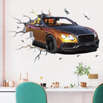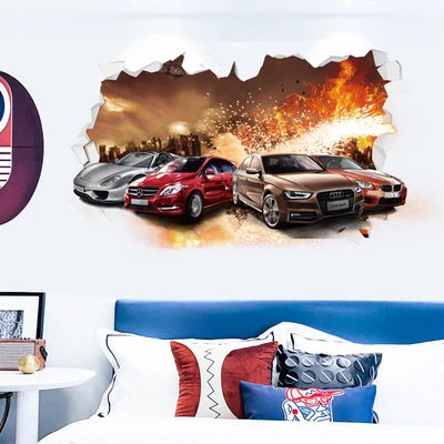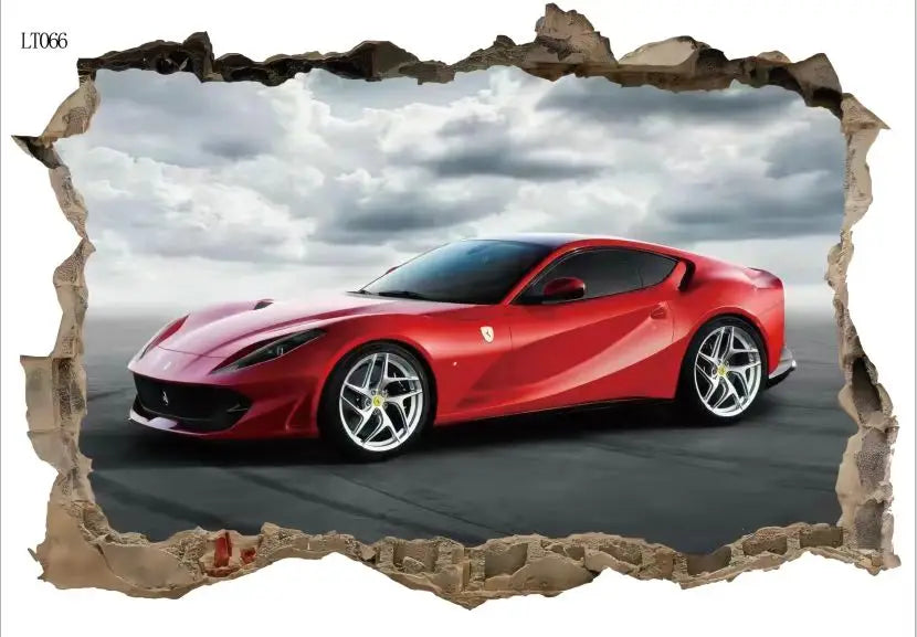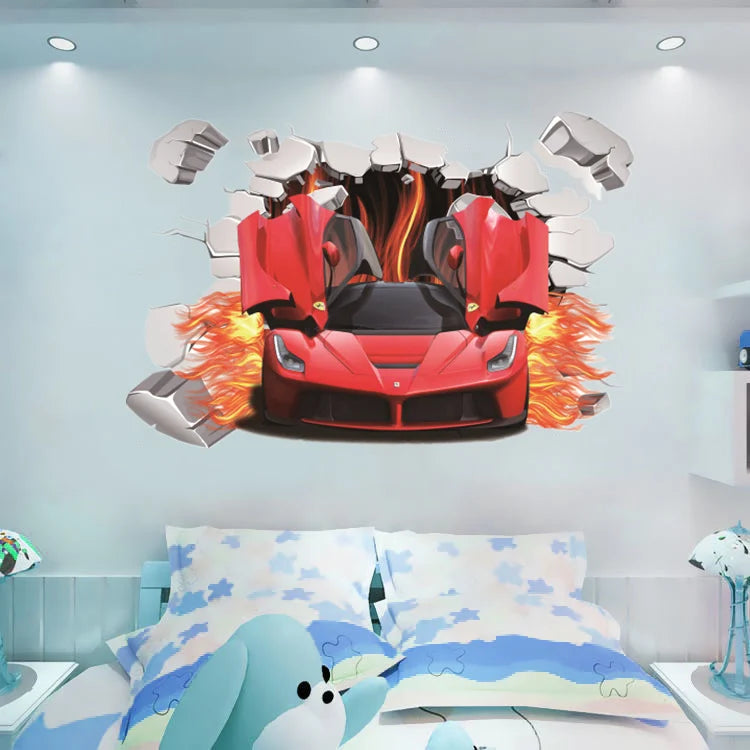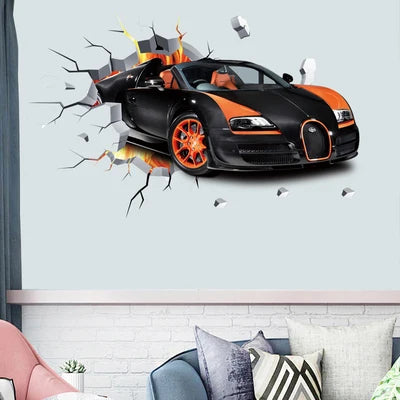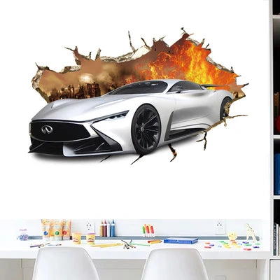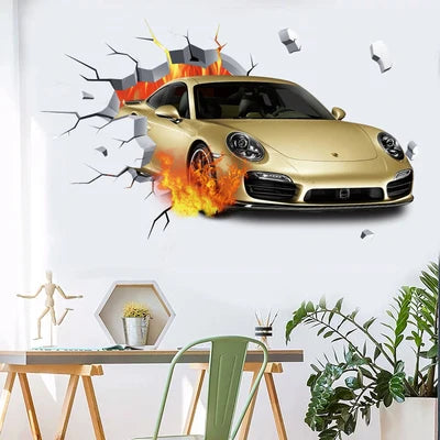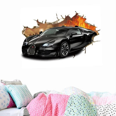 Sticker mural effet 3D spectaculaire : une voiture de sport surgissant d’un mur en feu