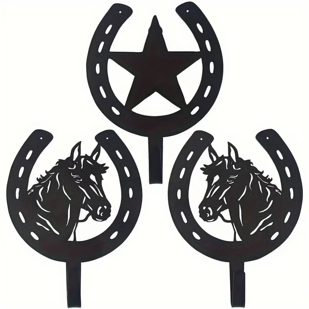 Ajoutez une note western élégante à votre décoration avec ce trio de crochets muraux au style country. Alliant le charme du fer à cheval et la noblesse du cheval, chaque pièce est à la fois un élément mural décoratif et un crochet fonctionnel.