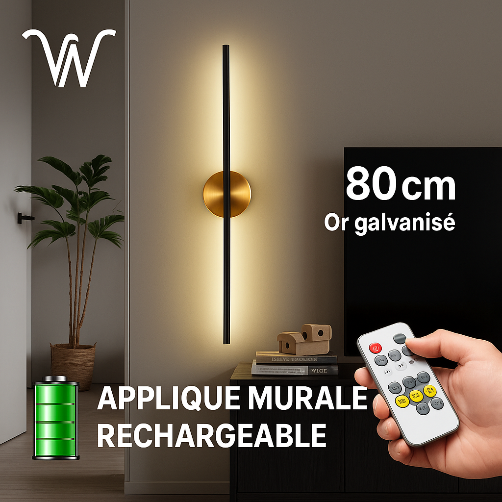 Apportez une touche moderne et élégante à votre intérieur avec cette lampe murale verticale de 80 cm. Dotée d'une finition or électrolytique raffinée, elle diffuse une lumière douce et chaleureuse vers le haut et le bas. Pratique et sans fil, elle fonctionne sur batterie rechargeable pour une installation facile, sans travaux. Contrôlez l’intensité et les modes d’éclairage à distance grâce à sa télécommande intuitive.