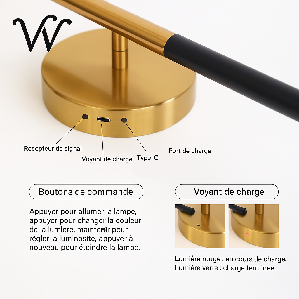 Caractéristiques : Recharge par USB, LED, sans fil, orientable