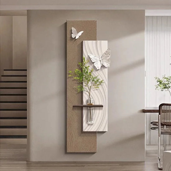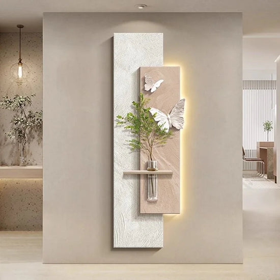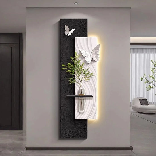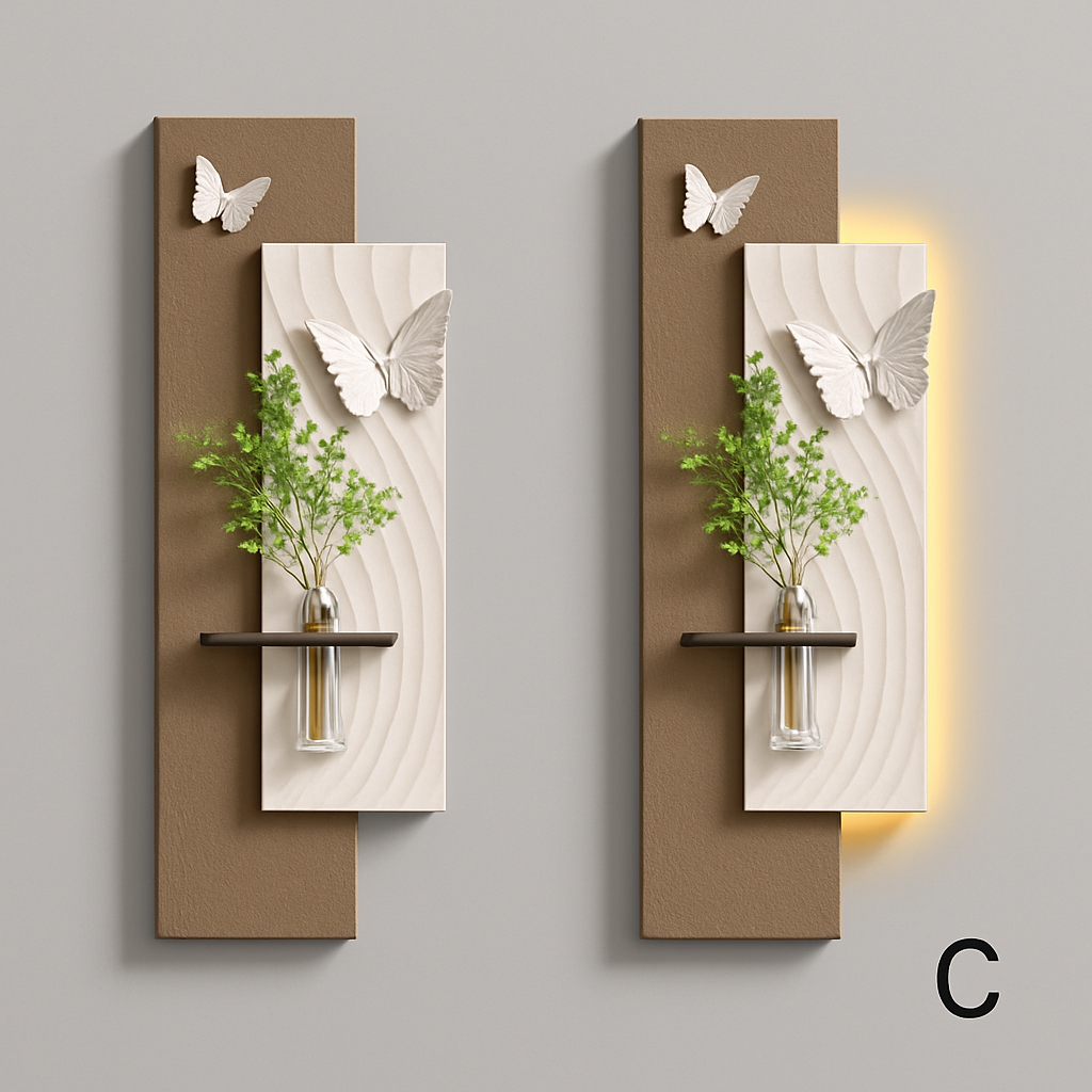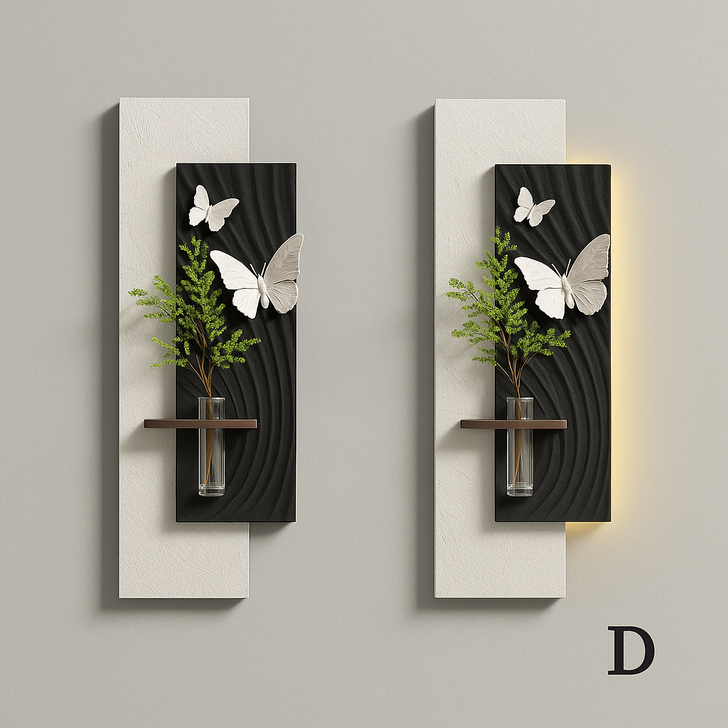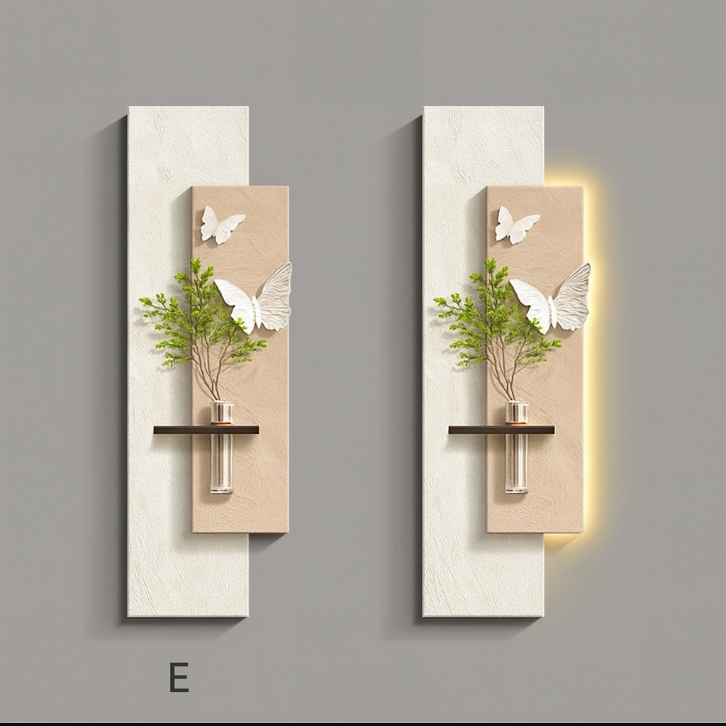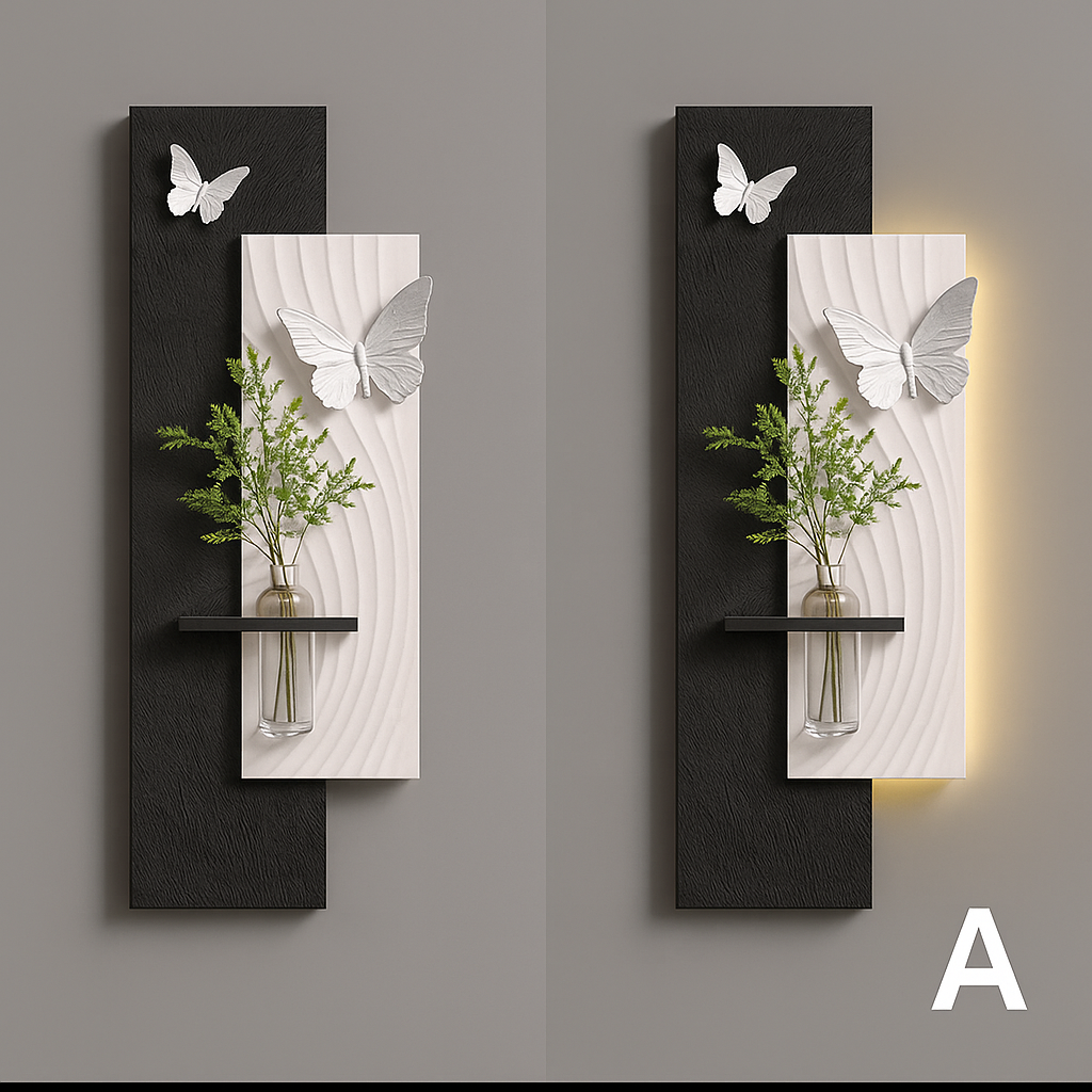 Apportez une touche de poésie et de modernité à votre intérieur avec cette élégante composition murale. Alliant contraste de couleur et de blanc, reliefs texturés et formes organiques, elle évoque la légèreté du papillon en plein envol. Une étagère intégrée accueille un vase suspendu, ajoutant une note végétale subtile. Le rétroéclairage LED diffuse une lumière douce qui sublime l’ensemble. Parfaite pour un salon, un hall ou un couloir au style contemporain raffiné.