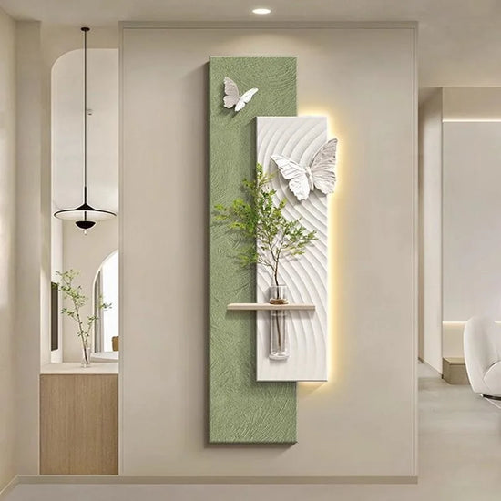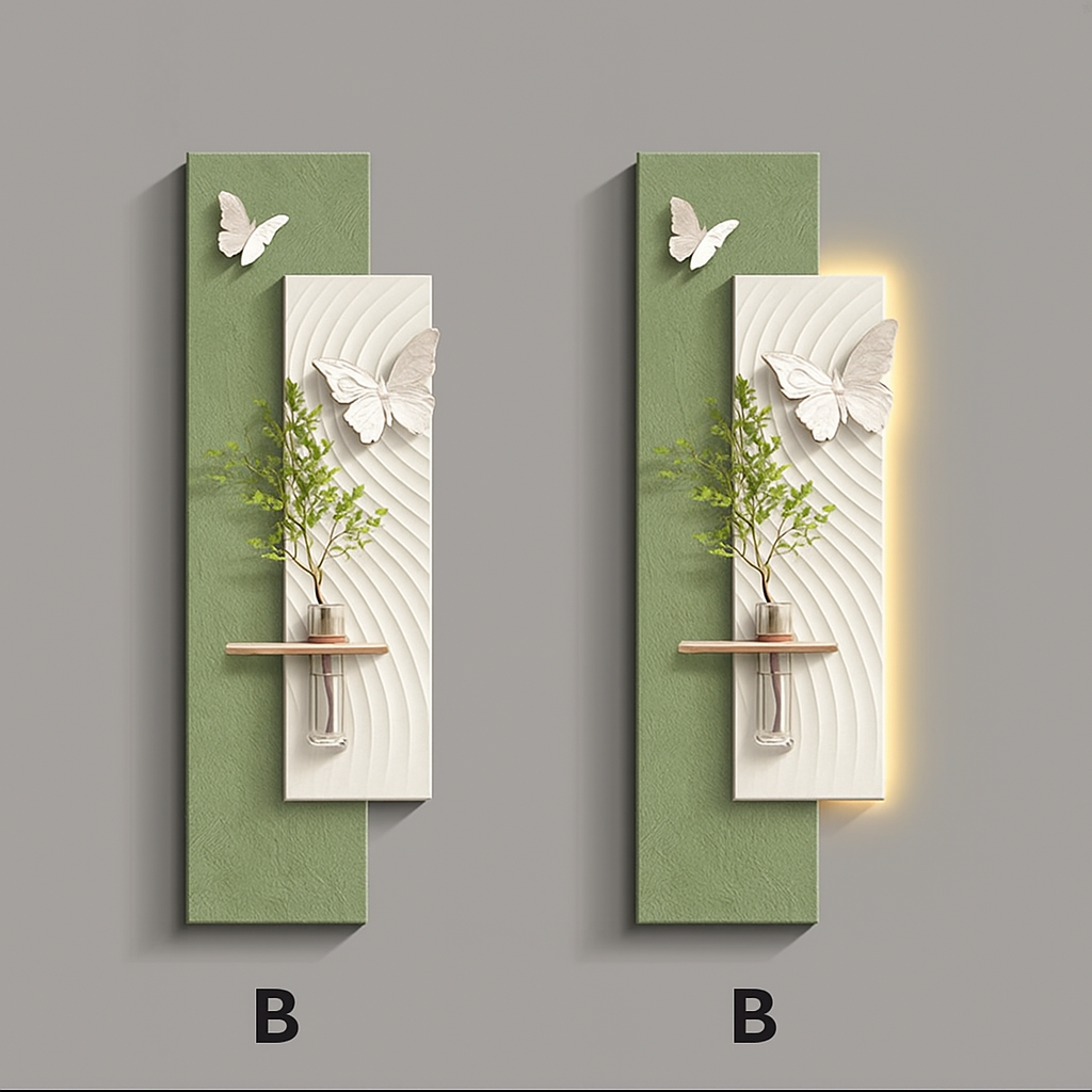 Les appliqués de papillons en relief apportent fraicheur et poésie à l’ensemble de panneaux contrastants et tout cela agrémentés d'une lumière douce reflétant le contour. La plante proposée apporte une touche naturelle et apaisante. Une recette gagnante qui plaira à tous.