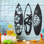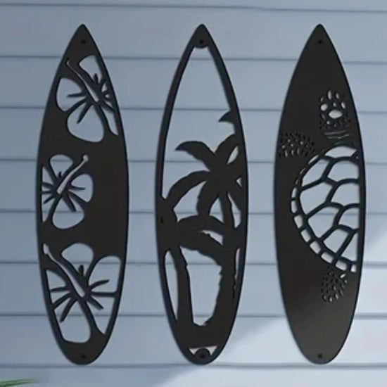 Ensemble de planches de surf murales au style tropical et marin, avec des découpes décoratives.
