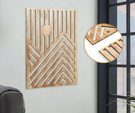 Apportez une touche naturelle et contemporaine à votre intérieur avec ce triptyque mural en bois sculpté. Chaque panneau dévoile un motif géométrique élégant évoquant des montagnes stylisées sous un soleil couchant. Le contraste subtil entre les découpes ajourées et le fond clair crée un jeu d’ombres raffiné. Parfait pour un salon, une chambre ou un bureau, cet ensemble minimaliste en bois clair s’intègre harmonieusement dans une déco scandinave, bohème ou moderne. Une œuvre d'art murale qui sublime l'espace tout en évoquant la nature avec douceur et modernité.
