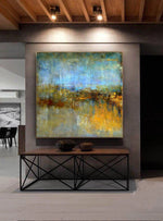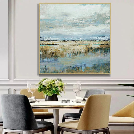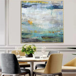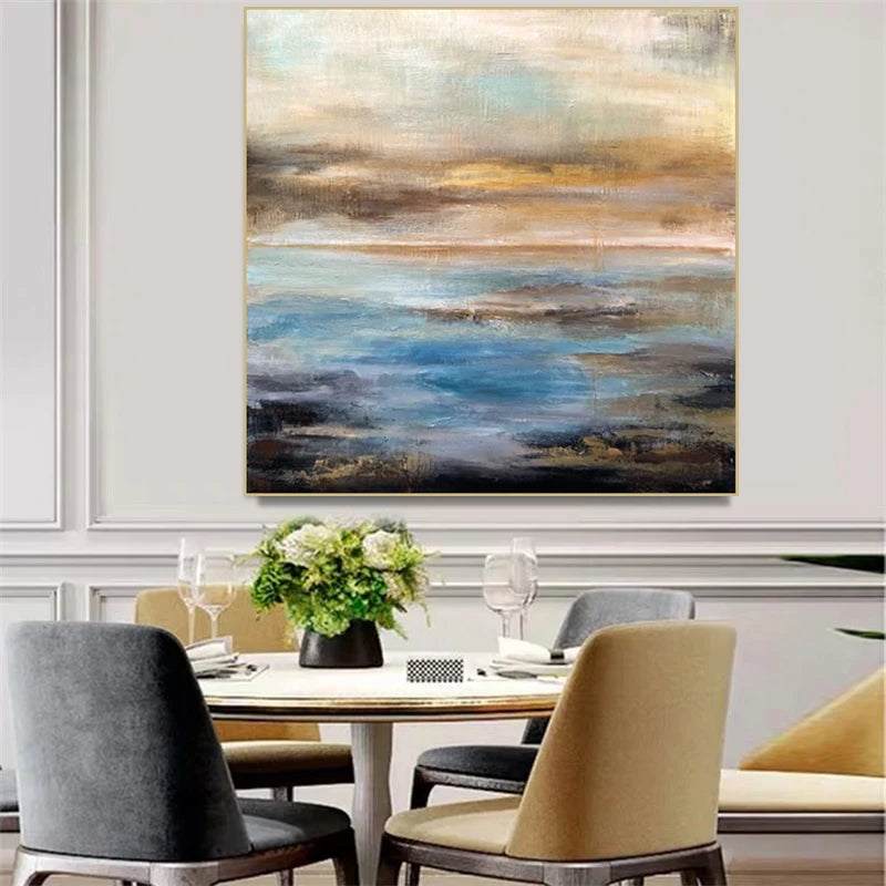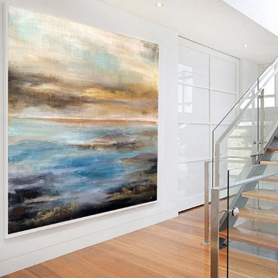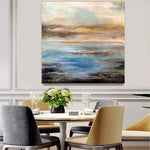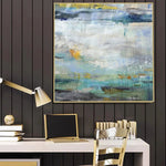 Ajoutez une touche d'élégance contemporaine à votre intérieur avec cette toile imprimée carrée, parfaite pour sublimer un salon, une chambre ou un espace bureau. Ce modèle met en scène un paysage abstrait aux nuances douces de bleu, beige et ocre, évoquant la quiétude d’un horizon au crépuscule.